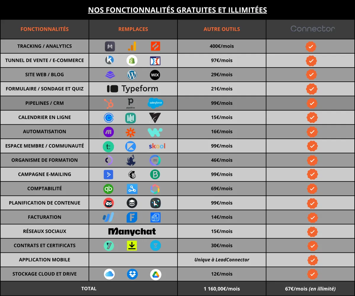 Centraliser tout et ne laissez plus votre budget s'envoler avec des solutions fragmentées ! Avec LeadConnector, profitez de la puissance d'un CRM avancé, propulsé par l'IA, conçu pour maximiser votre productivité et vos revenus.