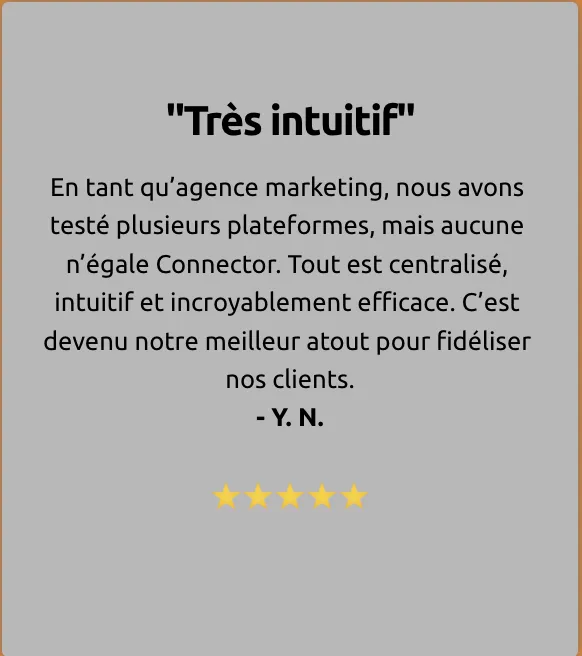 En tant qu’agence marketing, nous avons testé plusieurs plateformes, mais aucune n’égale Connector. Tout est centralisé, intuitif et incroyablement efficace. C’est devenu notre meilleur atout pour fidéliser nos clients.