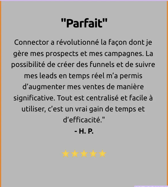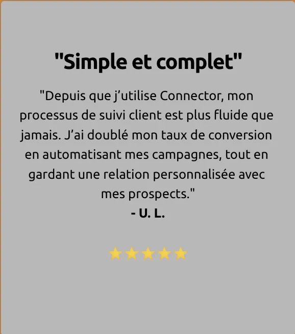 "Depuis que j’utilise Connector, mon processus de suivi client est plus fluide que jamais. J’ai doublé mon taux de conversion en automatisant mes campagnes, tout en gardant une relation personnalisée avec mes prospects."